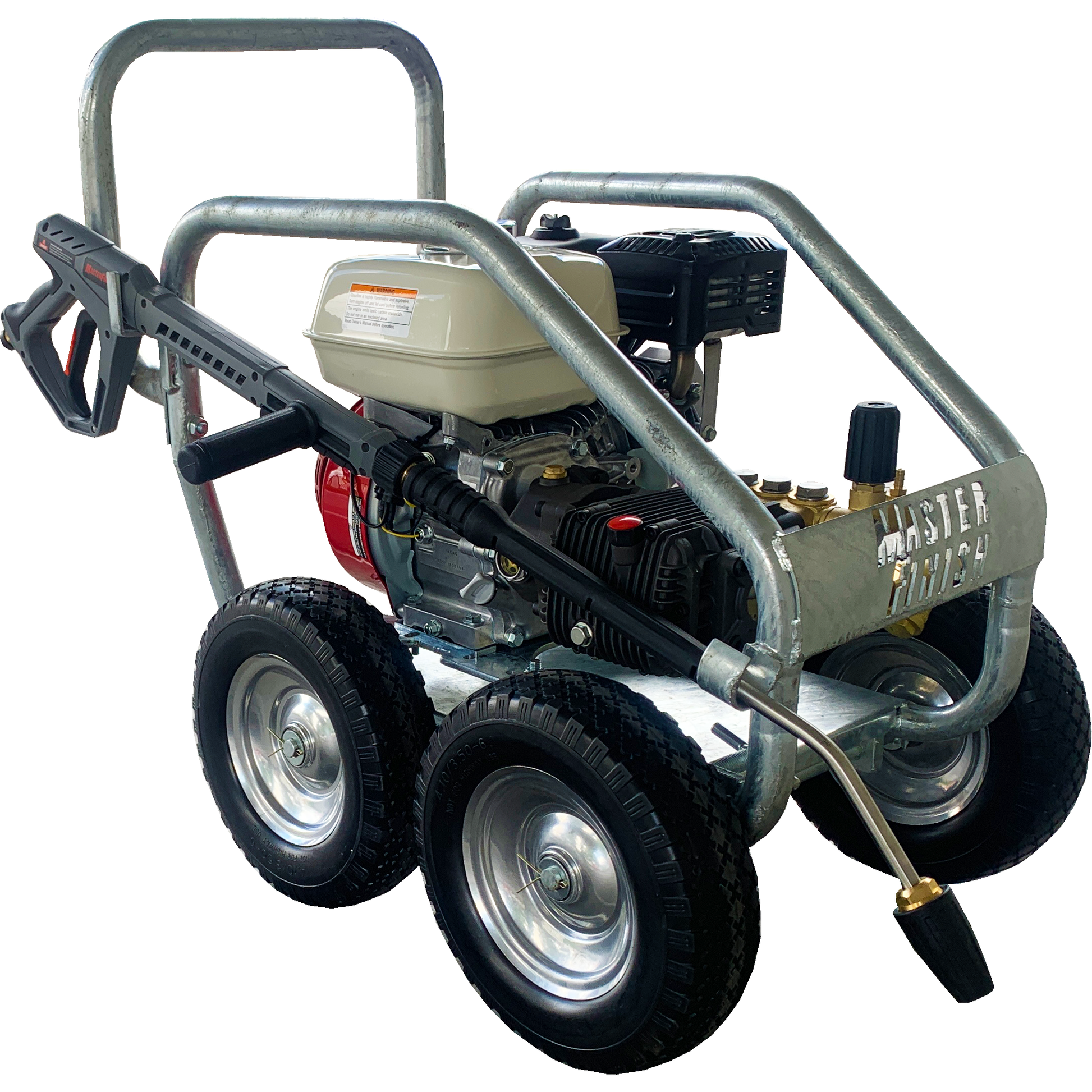 MasterFinish 3000 psi petrol powered pressure washer. Reduction triplex pump with NSK bearings, brass head, ceramic pistons, and stainless steel valves. Mounted in a galvanised steel frame. Powered by a genuine Honda GX200 4-stroke engine. Gear driven pump with thermal overload protection. 10 m non-marking hose with easy trigger gun, stainless steel lance with turbo nozzle, and spare lance with 15 degree nozzle.